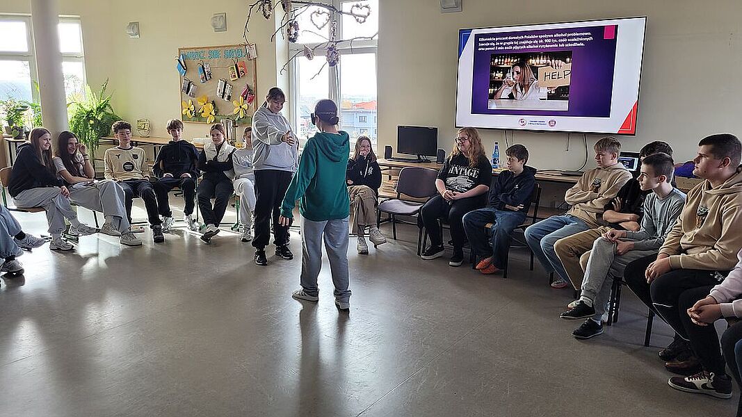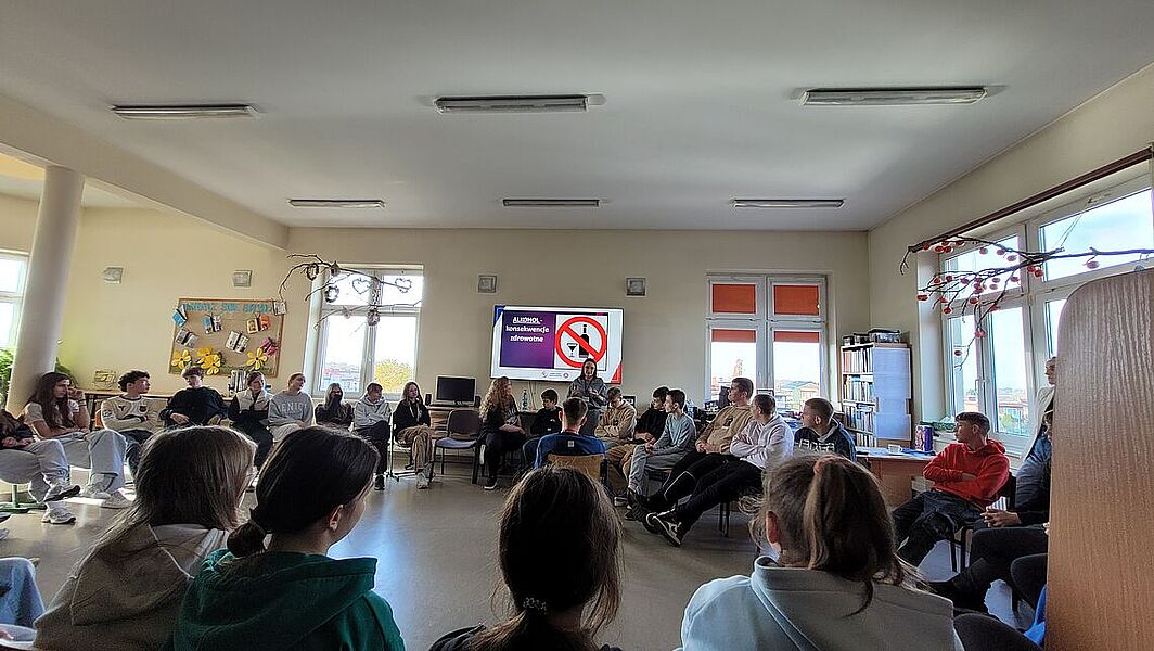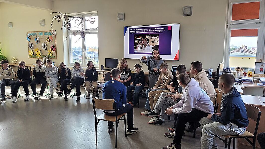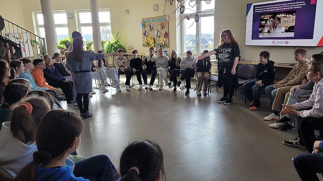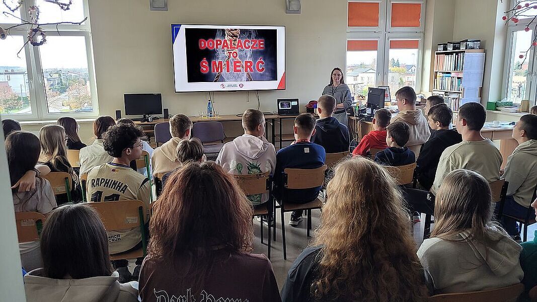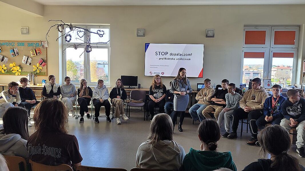 Podczas zajęć uczniowie dowiedzieli się, jak groźne dla zdrowia i życia mogą być dopalacze, alkohol oraz inne środki odurzające. Podczas prelekcji przedstawiono mechanizmy działania dopalaczy i alkoholu, możliwe skutki uboczne, a także omówiono realne przypadki zatruć i konsekwencje prawne związane z ich posiadaniem i używaniem. Warsztaty miały charakter praktyczny – młodzież aktywnie brała udział w rozmowie, zadawała pytania i dzieliła się własnymi spostrzeżeniami. Jednym z najciekawszych elementów zajęć była możliwość skorzystania z alkogogli. To specjalne okulary symulujące wpływ alkoholu na zmysły i koordynację ruchową. Uczniowie mogli przekonać się, jak pozornie proste czynności – np. przejście do kolegi czy przywitanie – stają się trudne, gdy percepcja jest zaburzona. Doświadczenie to wywarło duże wrażenie i stało się punktem wyjścia do rozmowy o zagrożeniach wynikających z podejmowania ryzykownych zachowań pod wpływem alkoholu.