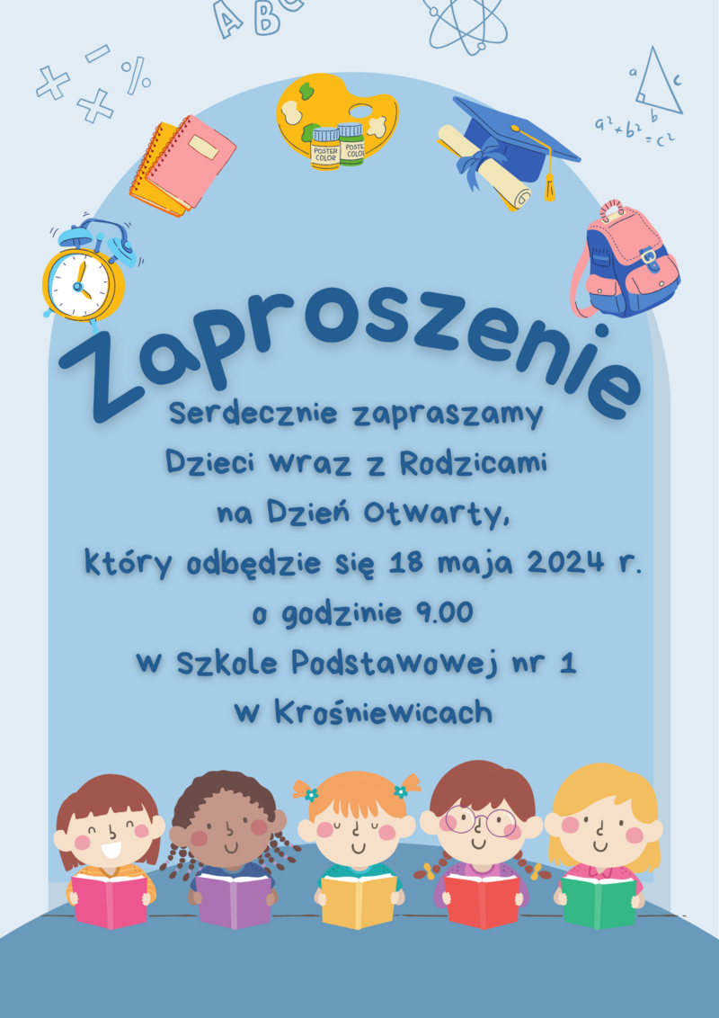 Serdecznie zapraszamy Dzieci (kandydatów do klas pierwszych) wraz z Rodzicami na Dzień Otwarty, który odbędzie się 18 maja 2024 roku o godzinie 9:00 w Szkole Podstawowej nr 1 w Krośniewicach.