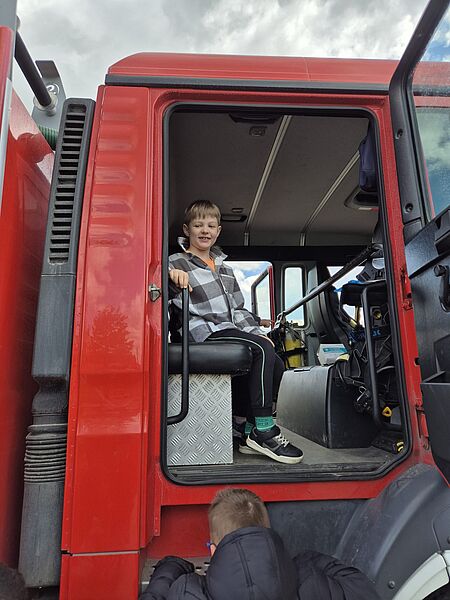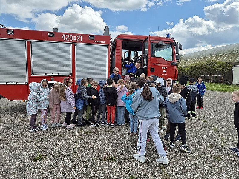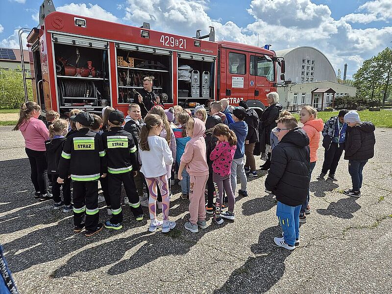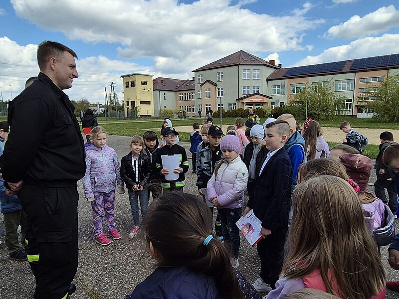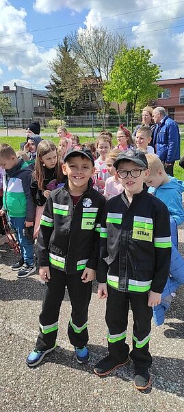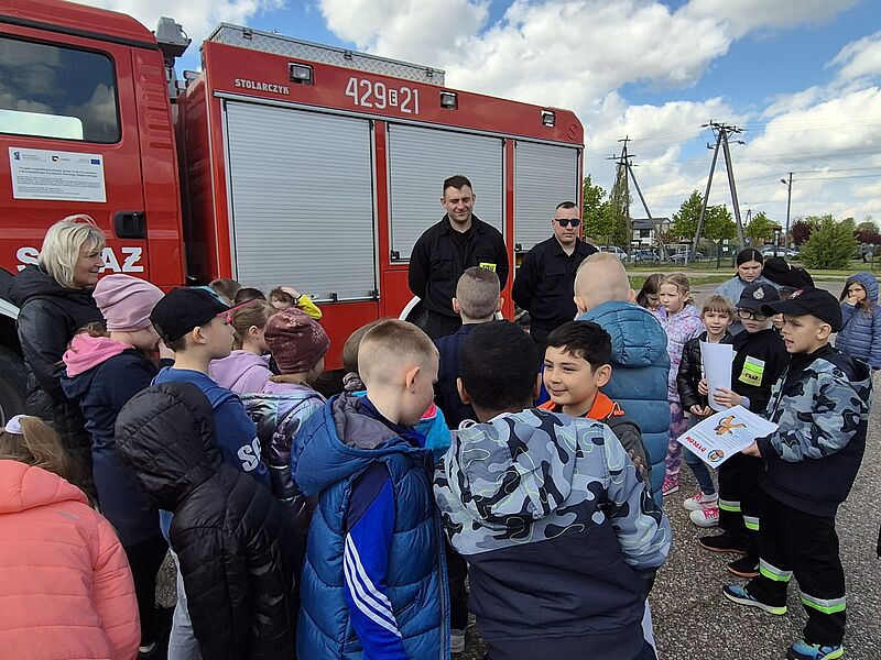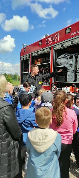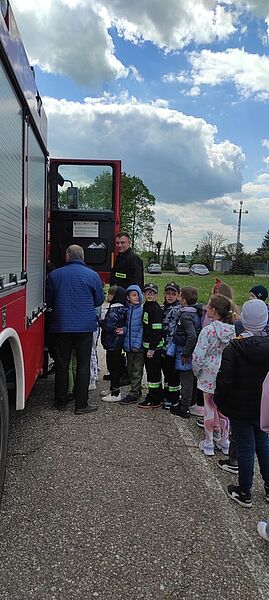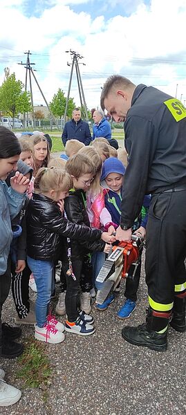 Dzieci były bardzo zainteresowane opowiadaniem panów, ale jeszcze bardziej sprzętem, którego mogły nie tylko dotknąć, ale spróbować się nim posługiwać, tak, jakby uczestniczyli w akcji. Dziękujemy panom strażakom za przybycie do nas. Była to wspaniała lekcja, bo im więcej wiemy o tej trudnej pracy, tym bardziej szanujemy jej wykonawców.