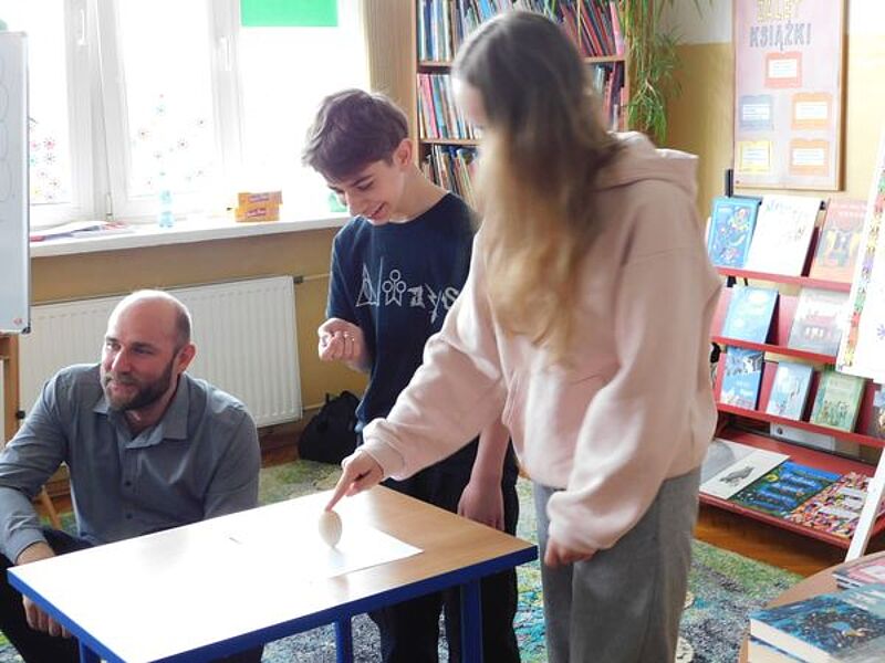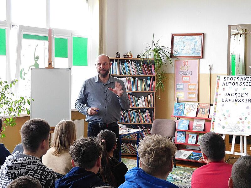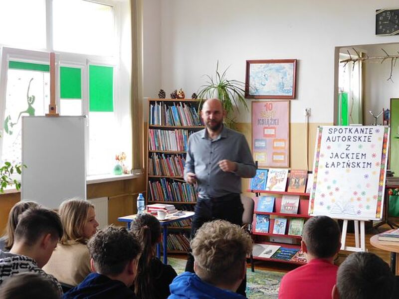 Spotkanie miało charakter motywacyjny. Autor najpierw poprosił publiczność o zadanie mu kilku pytań. Zapisał je na tablicy, a następnie porównał z przewidywanymi przez siebie pytaniami, które wcześniej spisał na kartce. W pierwszej grupie pisarz trafił w dziesiątkę – przewidział wszystkie pytania zadane przez młodzież, ale w drugiej grupie zgadł tylko jedno na pięć, co jest dowodem na to, że jeśli jesteśmy kreatywni, trudniej przewidzieć nasze działania. Następnie Jacek Łapiński odnosił się do pytań – opowiadał o sobie, podawał przykłady z własnego życia, a przy tym zachęcał odbiorców do nauki, do rozwijania pasji. Mówił też o korzyściach płynących z czytania – literatura otwiera nasze głowy, poszerza wyobraźnię i łatwiej szukamy rozwiązań nawet najbardziej oryginalnych problemów. Pisarz skłaniał do myślenia, np. pytając o różnicę między przyjemnością a satysfakcją z realizacji jakiegoś zadania. Na koniec gość zaproponował wykonanie dziwnego polecenia – należało postawić jajko na kartce papieru. Przedstawiciele jednej z grup znaleźli rozwiązanie, a to również wymagało kreatywności i nieschematycznego działania.