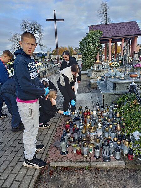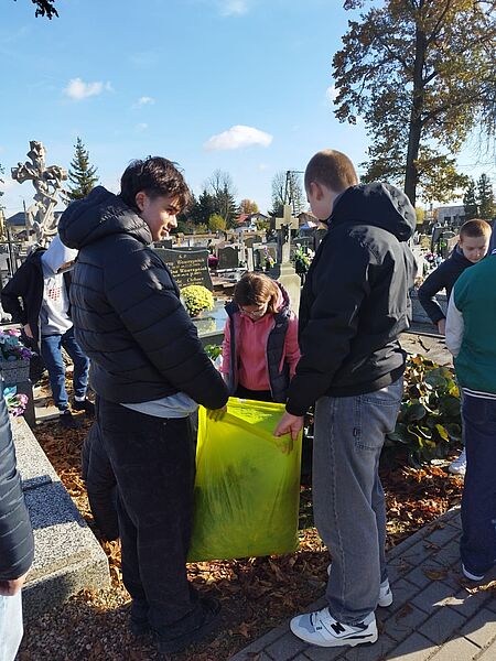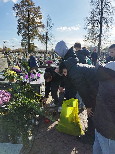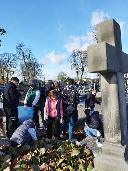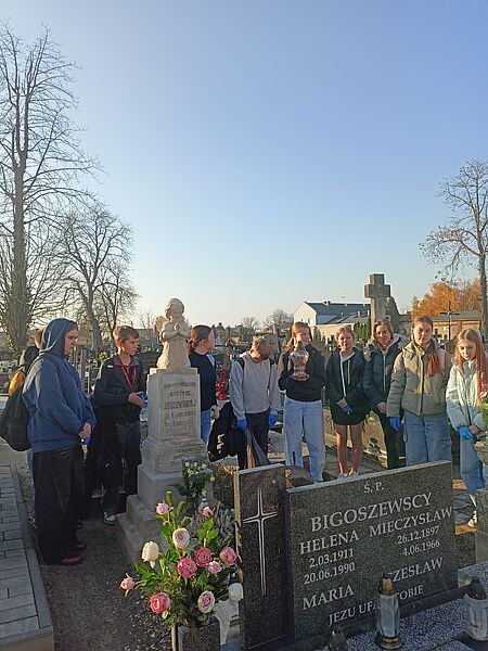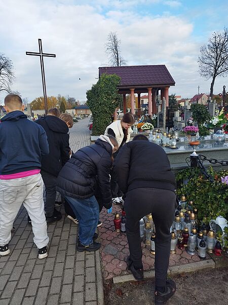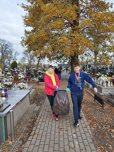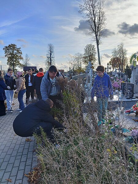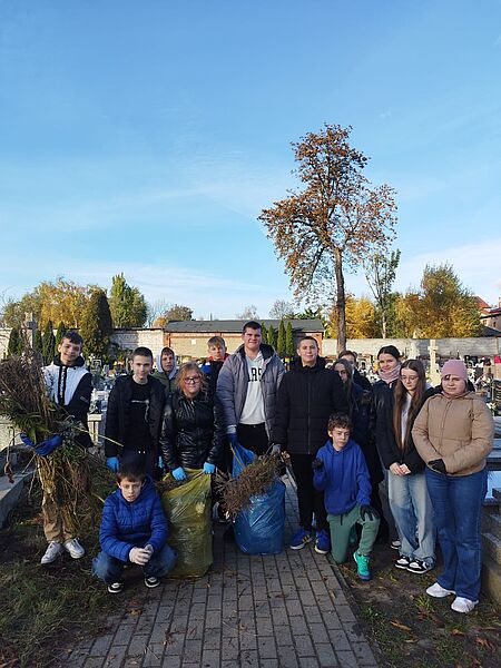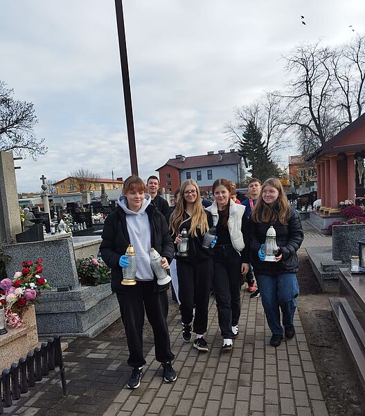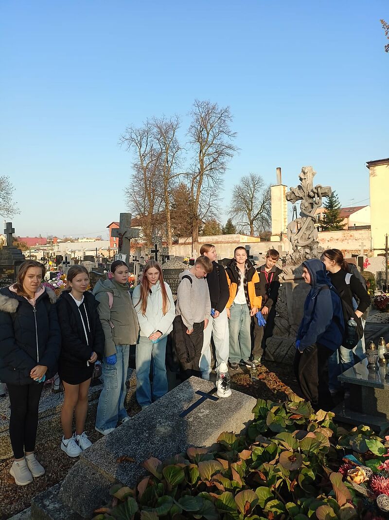 Listopad, to czas zadumy i pamięci o zmarłych. Tradycyjnie, jak co roku przed dniem Wszystkich Świętych uczniowie klas VIII b oraz VII b z wielkim zaangażowaniem porządkowali: Grób Nieznanego Żołnierza, Grób Rodaków Zamordowanych i Zaginionych na Wchodzie,Grób Więźniów Politycznych Zamordowanych w latach 1939 -1945, Grób rodziny Tarasiewiczów i Rembielińskich oraz groby opuszczone, zaniedbane, którymi się nikt nie zajmuje. Usuwali chwasty, rozbite znicze i zniszczone wiązanki, przywracając mogiłom godny wygląd. W tym roku również po święcie zmarłych uczniowie klas VIII a, VIIIb i VII a odwiedzili cmentarz i wynieśli na śmietnik kilka worków wypalonych zniczy. Młodzież nie tylko uporządkowała mogiły, ale także obejrzała zabytkowe nagrobki odrestaurowane za pieniądze zebrane podczas kilku ostatnich kwest zorganizowanych 1 listopada na parafialnym cmentarzu.