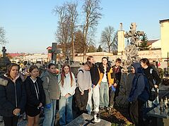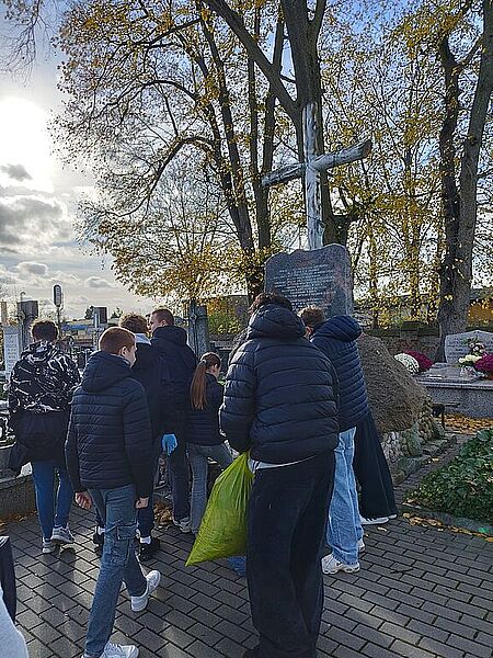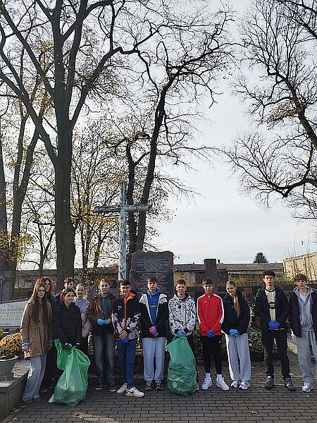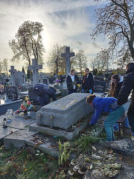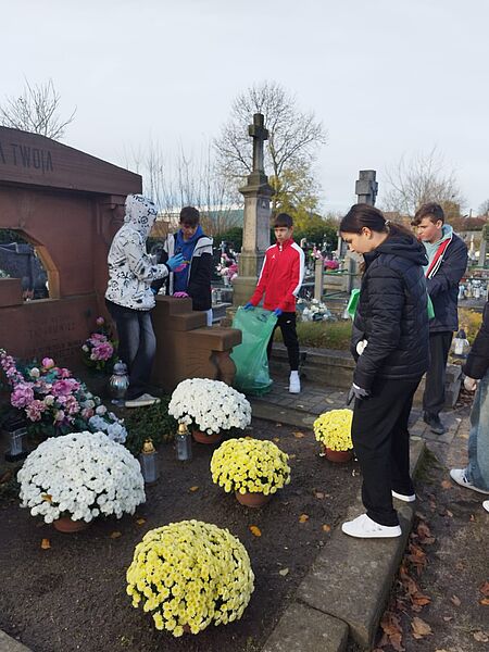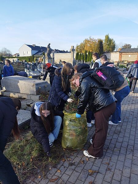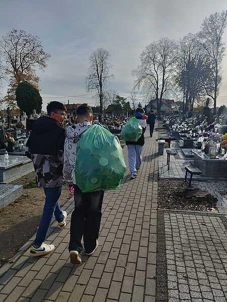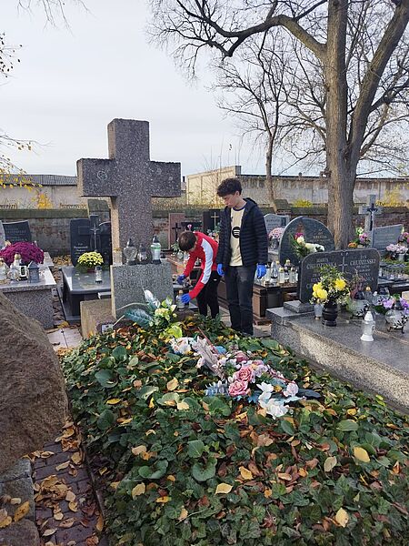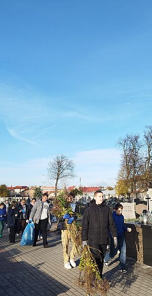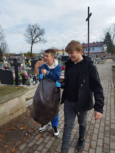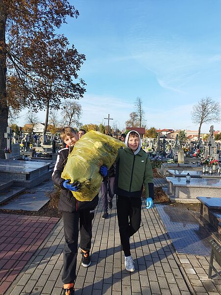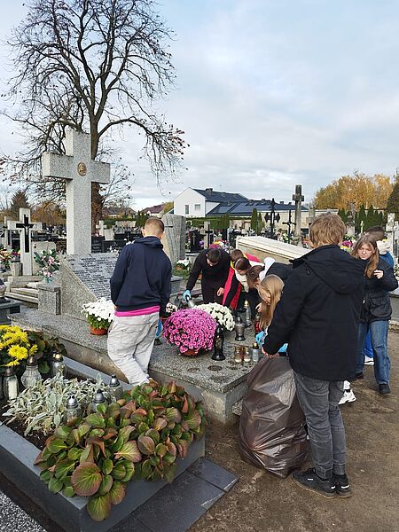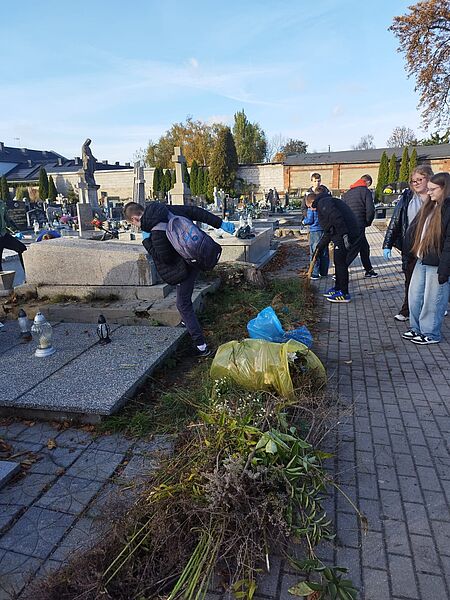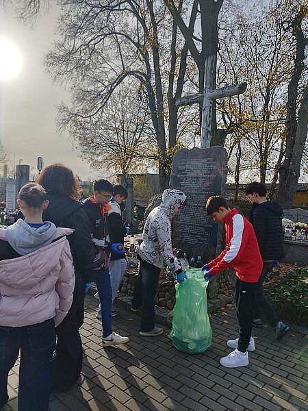 Listopad, to czas zadumy i pamięci o zmarłych. Tradycyjnie, jak co roku przed dniem Wszystkich Świętych uczniowie klas VIII b oraz VII b z wielkim zaangażowaniem porządkowali: Grób Nieznanego Żołnierza, Grób Rodaków Zamordowanych i Zaginionych na Wchodzie,Grób Więźniów Politycznych Zamordowanych w latach 1939 -1945, Grób rodziny Tarasiewiczów i Rembielińskich oraz groby opuszczone, zaniedbane, którymi się nikt nie zajmuje. Usuwali chwasty, rozbite znicze i zniszczone wiązanki, przywracając mogiłom godny wygląd. W tym roku również po święcie zmarłych uczniowie klas VIII a, VIIIb i VII a odwiedzili cmentarz i wynieśli na śmietnik kilka worków wypalonych zniczy. Młodzież nie tylko uporządkowała mogiły, ale także obejrzała zabytkowe nagrobki odrestaurowane za pieniądze zebrane podczas kilku ostatnich kwest zorganizowanych 1 listopada na parafialnym cmentarzu.