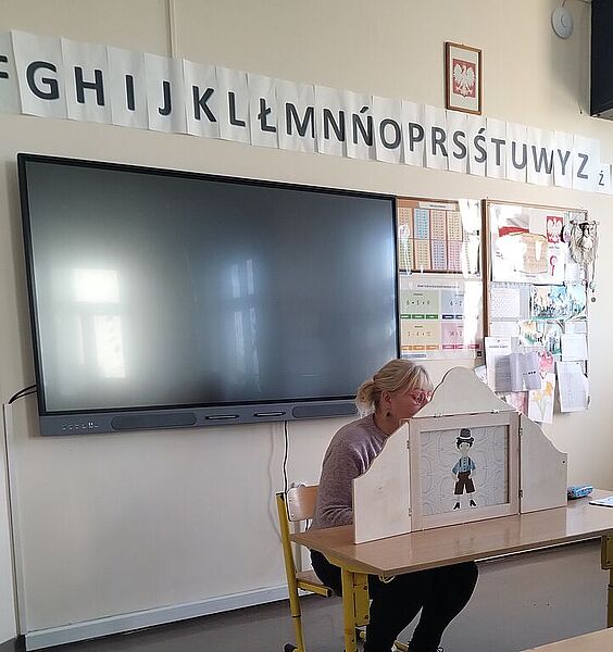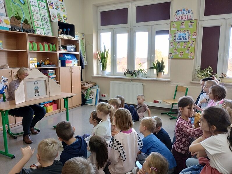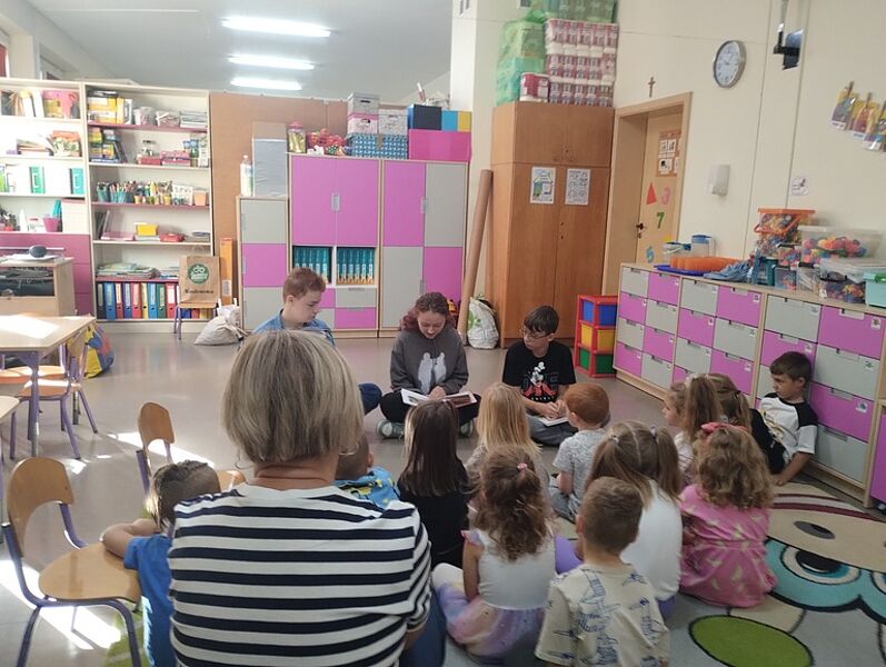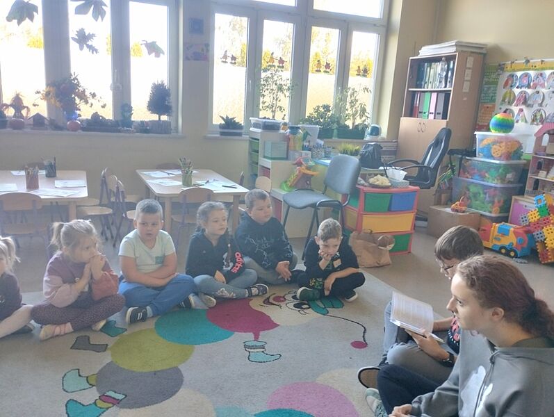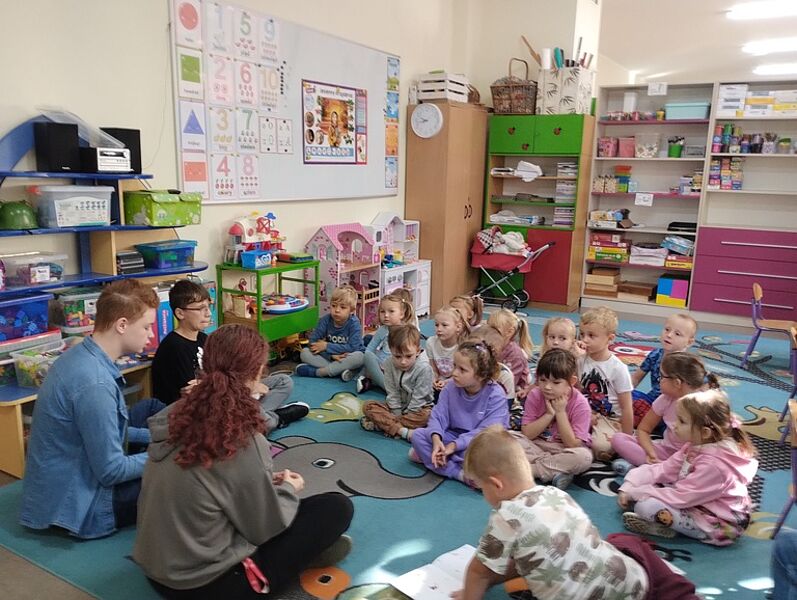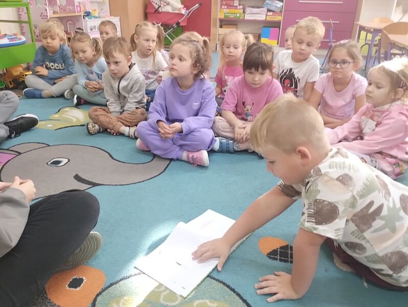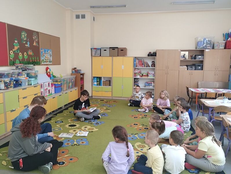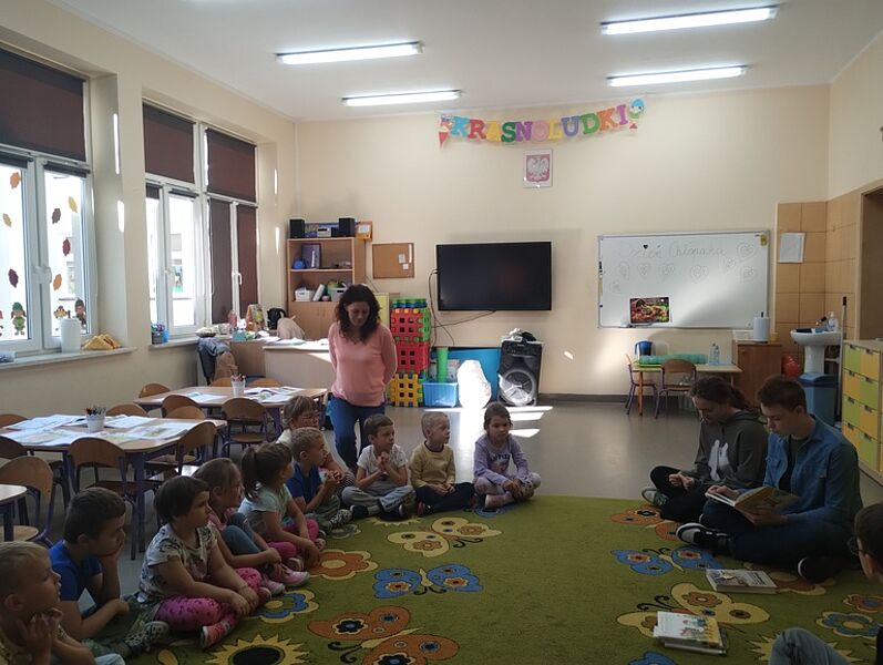 Pierwsze działanie w miesiącu poświęconym bibliotekom i ich funkcji integracyjnej odbyło się pod hasłem ,,Najstarsi dla najmłodszych”. Troje ósmoklasistów odwiedziło Przedszkole Miejskie w Krośniewicach, czyli naszych sąsiadów zza ściany. Zuzanna Manikowska, Oliwier Bloch i Karol Jóźwiak w grupach sześciolatków odczytali teksty Renaty Piątkowskiej pochodzące z tomów ,,Opowiadania do chichotania” i ,,Opowiadania z piaskownicy”, natomiast pięciolatki wysłuchały historii z cyklu ,,Masza i niedźwiedź”. Zabawne przygody bohaterów literackich spodobały się przedszkolakom – chętnie rozmawiali o tekstach i docenili ich humor.