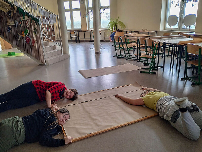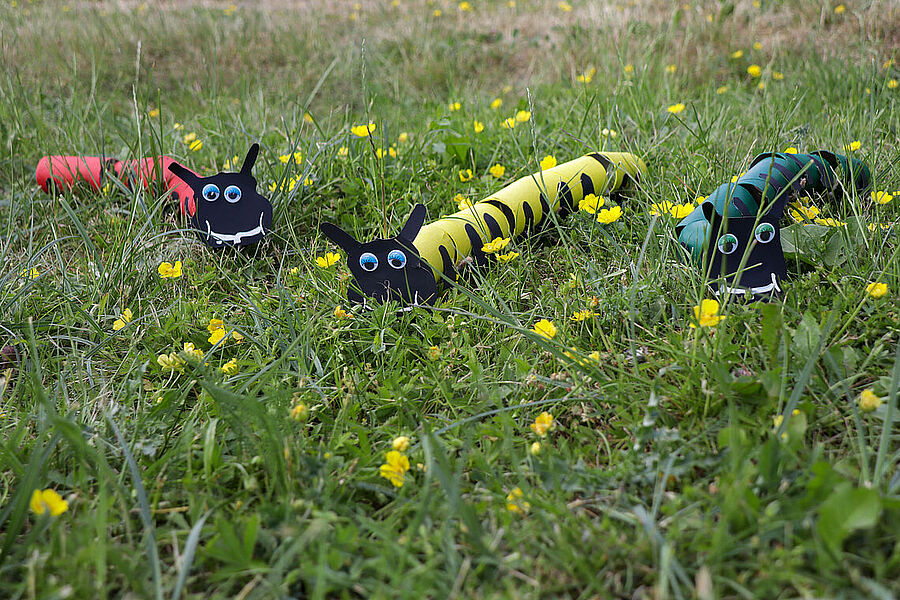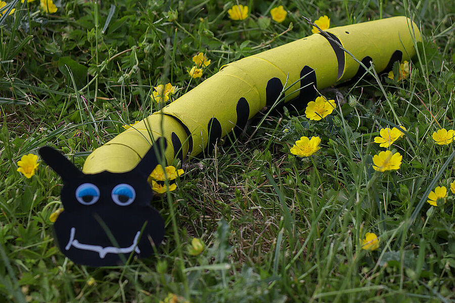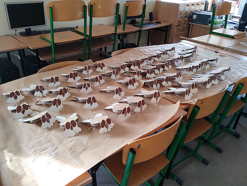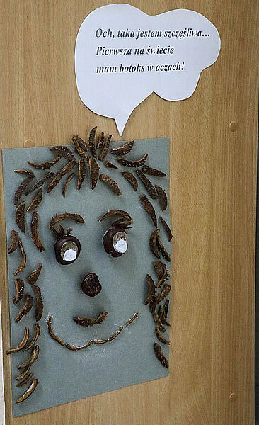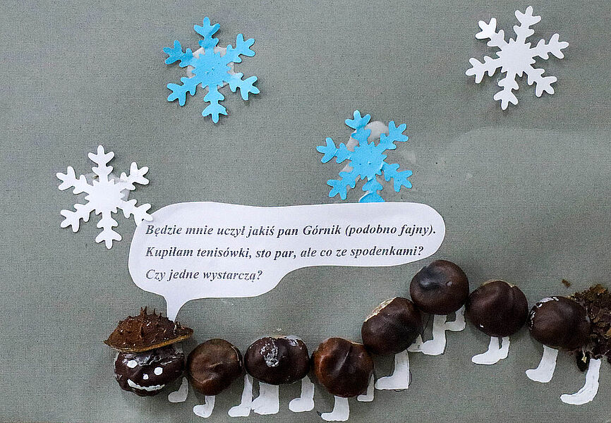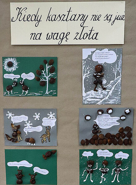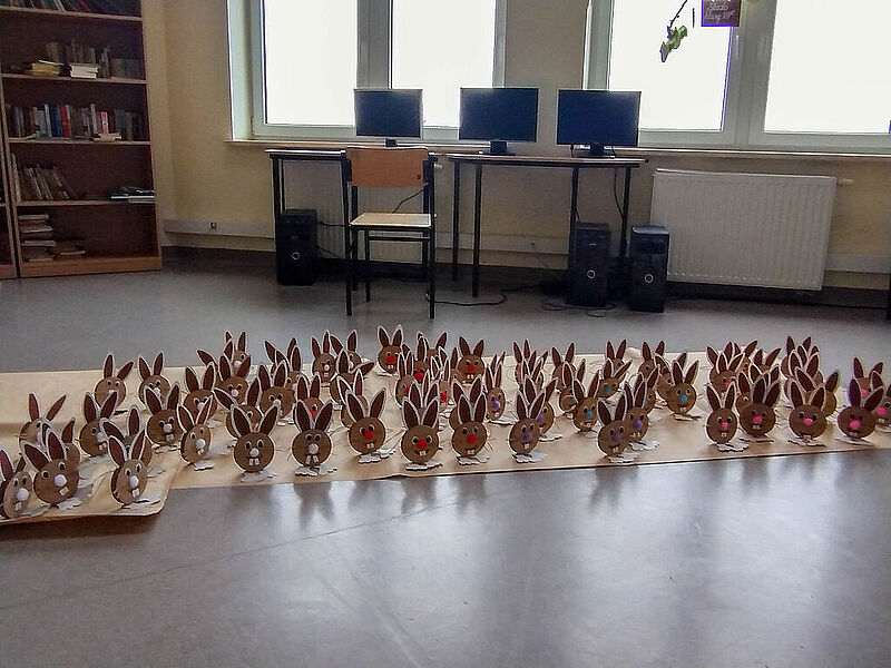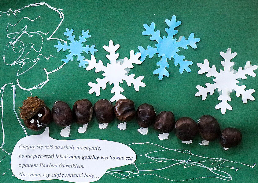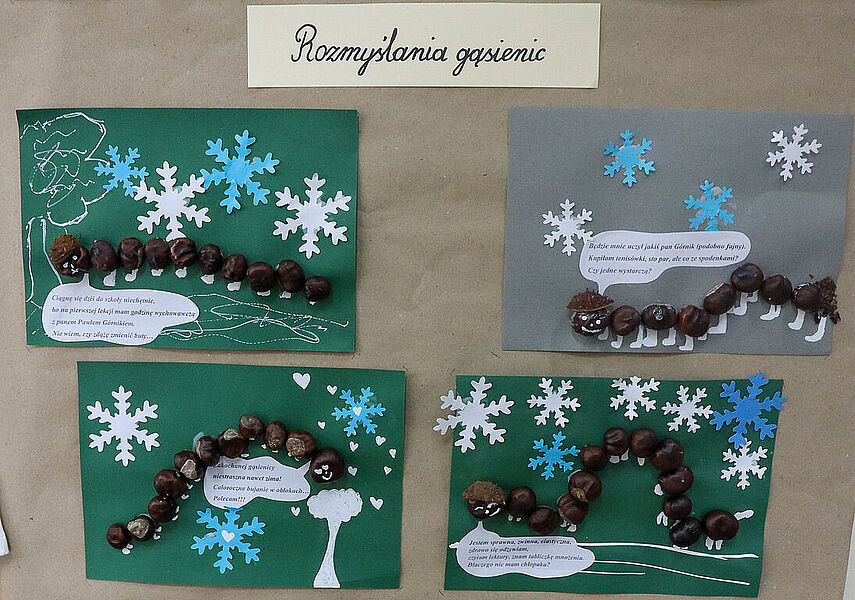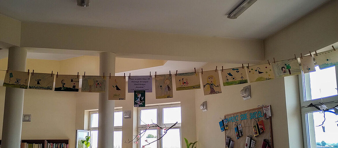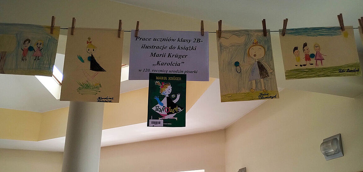 Prace plastyczne uczniowie wykonują także jako element zajęć promujących czytelnictwo. Słowo i obraz idą przecież w parze, uzupełniają się nawzajem i wspólnie tworzą materię książki. Obecnie bibliotekę zdobią prace uczniów klasy IIb – ilustracje do książki Marii Krüger ,,Karolcia”, przygotowane z wykorzystaniem magicznego niebieskiego koralika. W tym roku przypada 120. rocznica urodzin pisarki, którą na pewno znają i pamiętają mamy i babcie naszych uczniów, więc zajęcia upamiętniły niejako tę rocznicę. Natomiast uczniowie klas Ia i Ic zajmowali się w maju utworami, których bohaterkami są gąsienice – takie, które przemienią się w motyle, i stonogi, które nie radzą sobie z setką stóp potrzebujących obuwia na spacer. Gąsienice z tekturowych rolek, papieru i sznurka uczniowie wykonywali w parach.