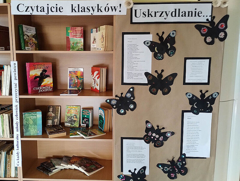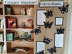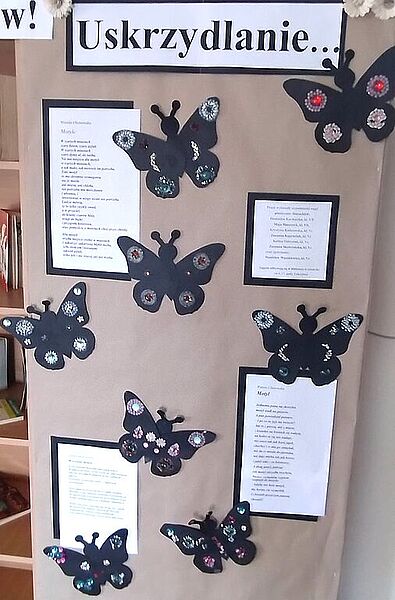 Tydzień Bibliotek w naszej szkole odbywał się pod hasłem ,,Wypożycz sobie skrzydła”. Grupa uczestnicząca w zajęciach literacko – plastycznych zajęła się tematem motyli w poezji. Powstały piękne prace ilustrujące utwory Wandy Chotomskiej i Jolanty Marii Dzienis. Wystawa nosi tytuł ,,Uskrzydlanie…”. Zajęcia od początku roku szkolnego odbywają się w bibliotece w każdy czwartek na 6. i 7. godzinie lekcyjnej. Uczestniczki realizują różne pomysły – od pisania wierszy po szydełkowanie i prace z wykorzystaniem różnych technik. Niektóre dzieła stworzone w tym roku szkolnym, utrwalone na fotografiach, prezentujemy poniżej.